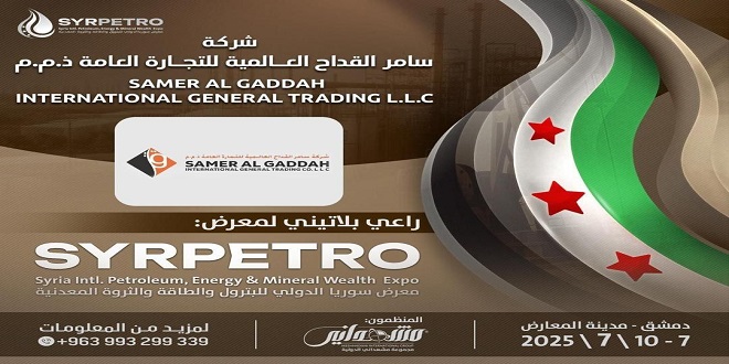 شركة “سامر القدّاح” العالمية للتجارة العامة ذ.م.م، الراعي البلاتيني لـ معرض سوريا الدولي للبترول والطاقة والثروة المعدنية سيربيترو 2025 بدورته السادسة، والذي تنظّمه مجموعة مشهداني الدولية للمعارض والمؤتمرات في دمشق، برعاية من وزارة الطاقة السورية، حيث سيقام على أرض مدينة المعارض بالعاصمة دمشق خلال الفترة من 7 حتى 10 من الشهر القادم.