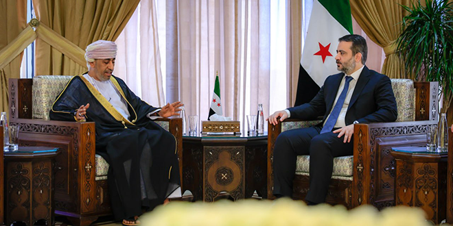 التقى وزير الخارجية والمغتربين “أسعد الشيباني” في دمشق،اليوم الأحد، سفير سلطنة عمان في الجمهورية العربية السورية “تركي بن محمود البوسعيدي”، حيث تناول اللقاء العلاقات بين البلدين وسبل تعزيزها، بما يخدم مصالح الشعبين الشقيقين.