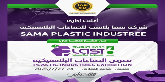 أعلنت شركة “سما بلاست للصناعات البلاستيكية” مشاركتها في المعرض السوري الدولي للصناعات البلاستيكية “سيريا بلاست”،والذي تنظّمه مجموعة مشهداني الدولية للمعارض والمؤتمرات في دمشق ،برعاية من وزارة الاقتصاد والصناعة السورية، وذلك على أرض مدينة المعارض بالعاصمة دمشق، خلال الفترة من 24 حتى 27 من شهر تموز الجاري، بالتزامن مع معرضي “روميكس وكيم إكسبو”.