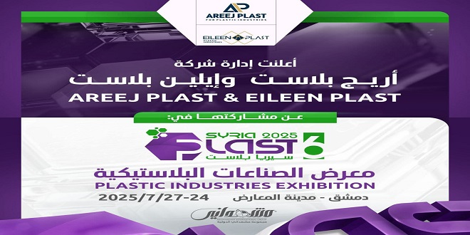 أعلنت إدارة شركة “أريج بلاست وإيلين بلاست” عن مشاركتها في معرض سوريا الدولي للصناعات البلاستيكية “سيريا بلاست”، بنسخته السادسة، والذي تنظّمه مجموعة مشهداني الدولية للمعارض والمؤتمرات، برعاية من وزارة الاقتصاد والصناعة السورية، وذلك على أرض مدينة المعارض بالعاصمة دمشق، خلال الفترة من 24 حتى 27 من شهر تموز الجاري، بالتزامن مع معرضي “روميكس وكيم إكسبو”.