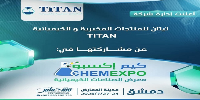 أعلنت شركة “تيتان للمنتجات المخبرية والكيميائية “عن مشاركتها في المعرض السوري الدولي للصناعات الكيميائية “كيم إكسبو”، والذي تنظّمه مجموعة مشهداني الدولية للمعارض والمؤتمرات في دمشق، برعاية من وزارة الاقتصاد والصناعة السورية، وذلك على أرض مدينة المعارض بالعاصمة دمشق، خلال الفترة من 24 حتى 27 من شهر تموز الجاري، بالتزامن مع معرضي “سيريا بلاست وروميكس”.