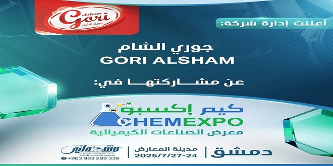 أعلنت شركة “جوري الشام” عن مشاركتها في المعرض السوري الدولي للصناعات الكيميائية “كيم إكسبو”، والذي تنظّمه مجموعة مشهداني الدولية للمعارض والمؤتمرات في دمشق، برعاية من وزارة الاقتصاد والصناعة السورية، وذلك على أرض مدينة المعارض بالعاصمة دمشق، خلال الفترة من 24 حتى 27 من شهر تموز الجاري، بالتزامن مع معرضي “سيريا بلاست وروميكس”.