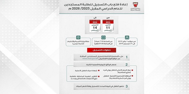 وتدعو الوزارة أولياء الأمور الراغبين في تسجيل أبنائهم من مواليد 1 كانون الثاني حتى 31 كانون الأول 2019 إلى زيارة الموقع الإلكتروني للوزارة www.moe.gov.bh للاطلاع على شروط التسجيل، والمستندات المطلوبة، وتحميل استمارة التسجيل.