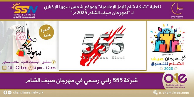 تشارك شركة “555” في مهرجان صيف الشام للتسوق 2025 والذي ينطلق في 18 ويستمر لمدة خمسة أيام حتى 22 أيلول من الشهر الحالي، وذلك على أرض ملاعب سكور الواقعة على أوتستراد المزة.