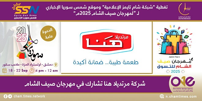 تشارك شركة “مرتديلا هنا” في مهرجان صيف الشام للتسوق 2025 والذي ينطلق في 18 ويستمر لمدة خمسة أيام حتى 22 أيلول من الشهر الحالي، وذلك على أرض ملاعب سكور الواقعة على أوتستراد المزة.