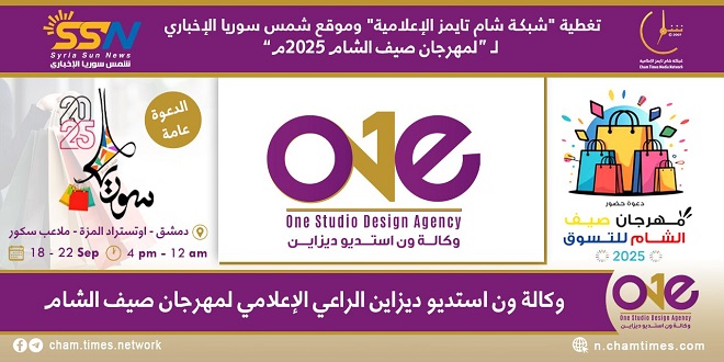 تشارك وكالة “ون استديو ديزاين” كراعي إعلامي في مهرجان صيف الشام للتسوق 2025 والذي ينطلق في 18 ويستمر لمدة خمسة أيام حتى 22 أيلول من الشهر الحالي، وذلك على أرض ملاعب سكور الواقعة على أوتستراد المزة.