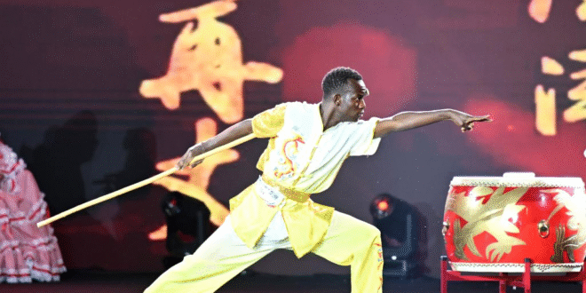 في الصورة الملتقطة يوم 26 إيلول 2025، متسابق يقدم عرضا أثناء نهائيات الدورة الـ18 لمسابقة “الجسر الصيني” للكفاءات الصينية لطلاب المدارس الثانوية الأجانب في تيانجين شمال الصين.