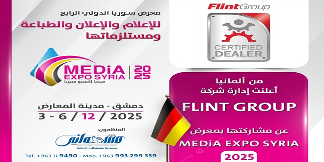أعلنت شركة “فلاينت كروب” عن مشاركتها في معرض سوريا الدولي الرابع للإعلام والإعلان والطباعة ومستلزماتها “ميديا إكسبو سيريا” ، والذي تستعد مجموعة مشهداني الدولية للمعارض والمؤتمرات لتنظيمه، من خلال استقطاب المؤسسات الإعلامية والإعلانية، حيث سيقام على أرض مدينة المعارض بدمشق، من تاريخ 3 وحتى 2025/12/6.