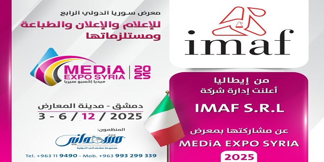 أعلنت شركة “IMAF S.r.l” عن مشاركتها في معرض سوريا الدولي الرابع للإعلام والإعلان والطباعة ومستلزماتها “ميديا إكسبو سيريا”، والذي تستعد مجموعة مشهداني الدولية للمعارض والمؤتمرات لتنظيمه، من خلال استقطاب المؤسسات الإعلامية والإعلانية، حيث سيقام على أرض مدينة المعارض بدمشق، من تاريخ 3 وحتى 2025/12/6.