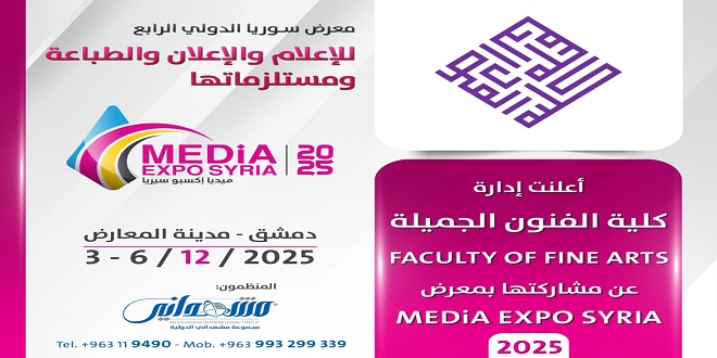 أعلنت شركة “كلية الفنون الجميلة” عن مشاركتها في معرض سوريا الدولي الرابع للإعلام والإعلان والطباعة ومستلزماتها “ميديا إكسبو سيريا” ، والذي تستعد مجموعة مشهداني الدولية للمعارض والمؤتمرات لتنظيمه، من خلال استقطاب المؤسسات الإعلامية والإعلانية، حيث سيقام على أرض مدينة المعارض بدمشق، من تاريخ 3 وحتى 2025/12/6.
