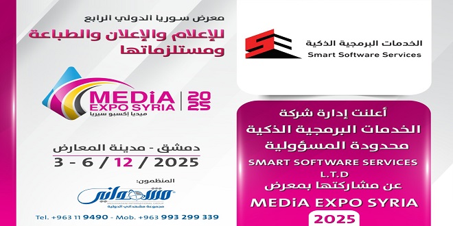 أعلنت شركة “الخدمات البرمجية الذكية” عن مشاركتها في  معرض سوريا الدولي الرابع للإعلام والإعلان والطباعة ومستلزماتها “ميديا إكسبو سيريا” ، والذي تستعد مجموعة مشهداني الدولية للمعارض والمؤتمرات لتنظيمه، من خلال استقطاب المؤسسات الإعلامية والإعلانية، حيث سيقام على أرض مدينة المعارض بدمشق، من تاريخ 3 وحتى 2025/12/6.