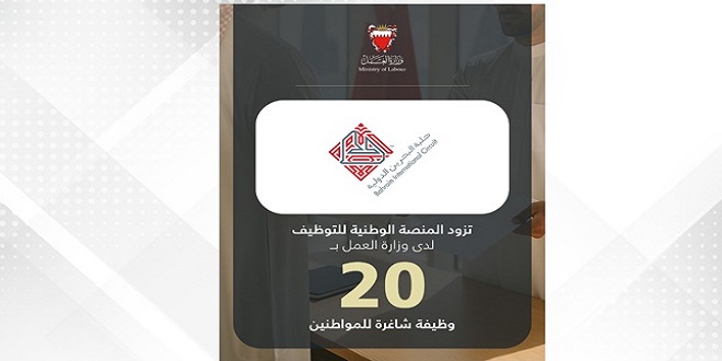 في إطار مواصلة الجهود الوطنية الرامية إلى توفير فرص عمل نوعية للمواطنين وتمكينهم من الإسهام الفاعل في مسيرة التنمية، أعلن سعادة السيد يوسف بن عبدالحسين خلف وزير الشؤون القانونية وزير العمل بالوكالة أن حلبة البحرين الدولية قامت بتزويد المنصة الوطنية للتوظيف التابعة لوزارة العمل بـ 20 وظيفة شاغرة مخصصة للمواطنين.