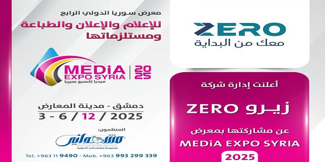 أعلنت شركة “زيرو” عن مشاركتها في معرض سوريا الدولي الرابع للإعلام والإعلان والطباعة ومستلزماتها “ميديا إكسبو سيريا” ، والذي تستعد مجموعة مشهداني الدولية للمعارض والمؤتمرات لتنظيمه، من خلال استقطاب المؤسسات الإعلامية والإعلانية، حيث سيقام على أرض مدينة المعارض بدمشق، من تاريخ 3 وحتى 2025/12/6.