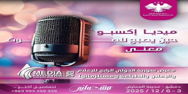“حين يصبح للإعلام معنى يتجسّد” استعدوا لحضور فعاليات معرض “ميديا إكسبو سيريا” بدورته الرابعة والذي يجمع بين المؤسسات الإعلامية والإعلانية، المطابع، صنّاع المحتوى وكل من يحمل رسالة ويؤديها بصوت يُسمع ، حيث سيقام المعرض على أرض مدينة المعارض بدمشق، من تاريخ 3 وحتى 2025/12/6.