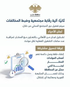 ولضمان تنفيذ القرار، تم تشكيل لجان رقابية في الأحياء بالتعاون مع المخاتير ولجان الأحياء ممثل عن محافظة حلب وأصحاب المولدات، من خلال إنشاء غرفة تنسيق مشتركة بغية متابعة الشكاوى وتنظيم الجولات الميدانية لضبط المخالفات، ومعالجة أي إشكال.