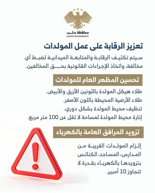 أعلنت محافظة حلب ،أول أمس، بدء تطبيق النظام الجديد لتنظيم عمل المولدات الكهربائية اعتباراً من الجمعة 24 تشرين الأول 2025، بهدف ضبط الأسعار وتحسين الخدمات وإنهاء حالات الاستغلال.