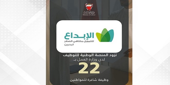 في إطار تنفيذ توجيهات صاحب السمو الملكي الأمير سلمان بن حمد آل خليفة ولي العهد رئيس مجلس الوزراء حفظه الله، بعرض 3 فرص وظيفية لكل باحث عن عمل مسجل لدى وزارة العمل، شركة الإبداع للتمويل متناهي الصغر تزود المنصة الوطنية للتوظيف بـ 22 وظيفة شاغرة للمواطنين.