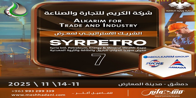“مجموعة عبد الكريم” الشريك الإستراتيجي لـ معرض سوريا الدولي للبترول والطاقة والثروة المعدنية، تحت رعاية وزارة الطاقة السورية وبمشاركات محلية ودولية واسعة، حيث تستعد مجموعة مشهداني الدولية لتنظيم دورة استثنائية من المعرض، تحت اسم “سيربترو_7″، وذلك على أرض مدينة المعارض بدمشق خلال الفترة من 2025/11/11 ولغاية 2025/11/14.