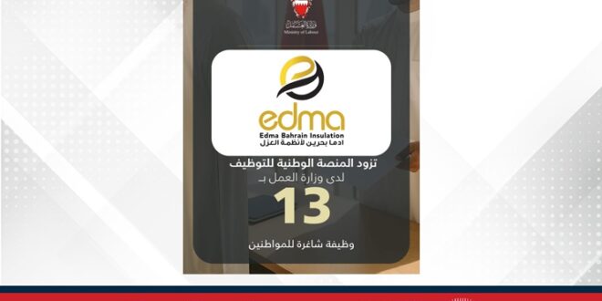 في إطار تنفيذ توجيهات صاحب السمو الملكي الأمير “سلمان بن حمد آل خليفة” ولي العهد رئيس مجلس الوزراء حفظه الله، بعرض 3 فرص وظيفية لكل باحث عن عمل مسجل لدى وزارة العمل، “ادما بحرين” لأنظمة العزل تزود المنصة الوطنية للتوظيف بـ 13 وظيفة شاغرة للمواطنين.