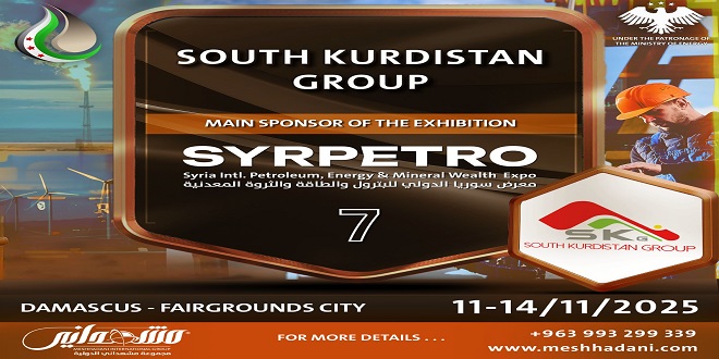 “مجموعة جنوب كردستان” الراعي الرئيسي لـ معرض سوريا الدولي للبترول والطاقة والثروة المعدنية، تحت رعاية وزارة الطاقة السورية وبمشاركات محلية ودولية واسعة، حيث تستعد مجموعة مشهداني الدولية لتنظيم دورة استثنائية من المعرض، تحت اسم “سيربترو_7″، وذلك على أرض مدينة المعارض بدمشق خلال الفترة من 2025/11/11 ولغاية 2025/11/14.
