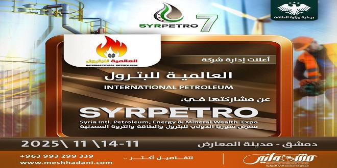 أعلنت شركة“ العالمية للبترول ” عن مشاركتها في معرض سوريا الدولي للبترول والطاقة والثروة المعدنية، تحت رعاية وزارة الطاقة السورية وبمشاركات محلية ودولية واسعة، حيث تستعد مجموعة مشهداني الدولية لتنظيم دورة استثنائية من المعرض، تحت اسم “سيربترو_7″، وذلك على أرض مدينة المعارض بدمشق خلال الفترة من 2025/11/11 ولغاية 2025/11/14.