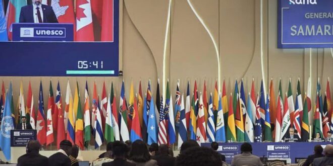 وانطلقت أعمال الدورة الثالثة والأربعين للمؤتمر العام لليونسكو بمشاركة سوريا في الـ 30 من تشرين الأول الفائت في مدينة سمرقند بأوزبكستان بمشاركة 194 دولة، وتستمر حتى الـ 13 من تشرين الثاني الجاري.