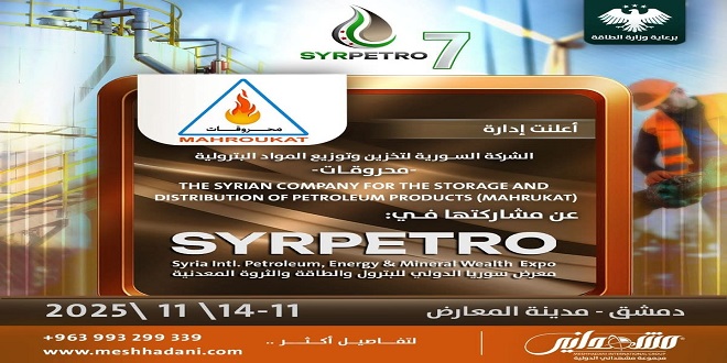أعلنت شركة“ السورية لتخزين وتوزيع المواد البترولية “محروقات” ” عن مشاركتها في معرض سوريا الدولي للبترول والطاقة والثروة المعدنية، تحت رعاية وزارة الطاقة السورية وبمشاركات محلية ودولية واسعة، حيث تستعد مجموعة مشهداني الدولية لتنظيم دورة استثنائية من المعرض، تحت اسم “سيربترو_7″، وذلك على أرض مدينة المعارض بدمشق خلال الفترة من 2025/11/11 ولغاية 2025/11/14.