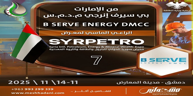 “بي سيرف إينرجي م.د.م.س” الراعي الماسي لـ معرض سوريا الدولي للبترول والطاقة والثروة المعدنية، تحت رعاية وزارة الطاقة السورية وبمشاركات محلية ودولية واسعة، حيث تستعد مجموعة مشهداني الدولية لتنظيم دورة استثنائية من المعرض، تحت اسم “سيربترو_7″، وذلك على أرض مدينة المعارض بدمشق خلال الفترة من 2025/11/11 ولغاية 2025/11/14.