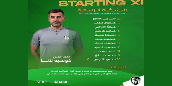 أعلن المدير الفني لمنتخب سوريا للرجال بكرة القدم “خوسيه لانا” التشكيلة التي سيخوض بها منتخبنا مباراته مع نظيره الباكستاني في وقت لاحق اليوم على ملعب جناح ستاديوم في العاصمة الباكستانية إسلام آباد، ضمن الجولة الخامسة من التصفيات المؤهلة لكأس آسيا 2027 .