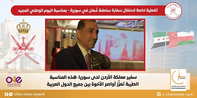 وجّه سفير المملكة الأردنية الهاشمية لدى الجمهورية العربية السورية الدكتور “سفيان القضاة” أطيب التهاني والتبريكات لسلطنة عُمان بمناسبة العيد الوطني الـ 55، قائلاً: “يسعدني في هذا المساء الطيب الكريم أن أشارك زميلي سعادة سفير سلطنة عُمان لدى سوريا الشقيقة في هذا الاحتفال المهيب والكريم بمناسبة العيد الوطني المجيد”.