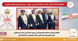 نظّمت السفارة العُمانية في دمشق ممثلةً بالسفير “تركي بن محمود البوسعيدي” حفل استقبال بمناسبة العيد الوطني لسلطنة عُمان، وذلك في فندق “داما روز بدمشق”.