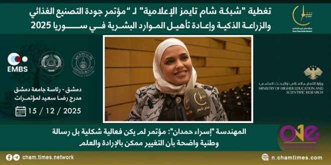 أكدت المهندسة “إسراء حمدان” رئيس مجلس إدارة E.M.B.S للهندسة الإدارية والجودة أن سوريا تستحق اليوم أكثر من أي وقت مضى عملااً جاداً يضمن أمنها الغذائي وسلامة غذاء مواطنيها، مشددة على أن هذا المؤتمر لم يكن فعالية شكلية، بل رسالة وطنية واضحة بأن التغيير ممكن بالإرادة والعلم والعمل المشترك.