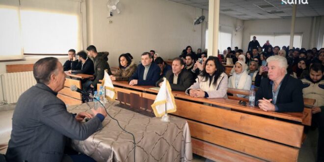 المحاضرة “مدينة تدمر الأثرية كموقع تراثي عالمي” أقيمت بمناسبة يوم التحرير، واستهلها الدكتور “الحريري” بالتعريف بمدينة تدمر التي تقع في قلب البادية السورية، وأهمية موقعها الاستراتيجي على الطريق التجاري العالمي القديم، ما جعلها عقدة مواصلات تجارية رئيسية للقوافل، والتي كانت تمتد آلاف الكيلومترات على طريق الحرير.