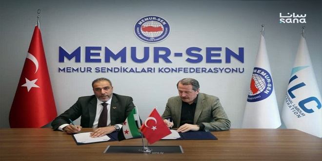 وقّع الاتحاد العام لنقابات العمال في سوريا، واتحاد نقابات موظفي القطاع العام في تركيا (MEMUR‑SEN) اتفاقية تعاون، لتطوير العلاقات النقابية وتبادل الخبرات والوفود، وتعزيز العمل الثنائي في القضايا ذات الاهتمام المشترك.