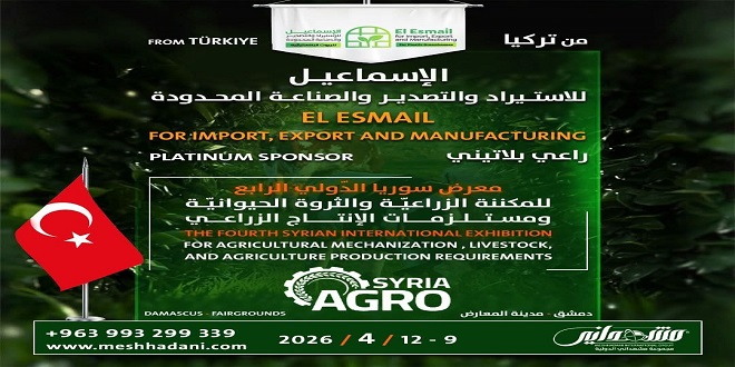 “الإسماعيل للاستيراد والتصدير والصناعة المحدودة” الراعي البلاتيني لـ معرض سوريا الدولي الرابع للمكننة الزراعية والثروة الحيوانية ومستلزمات الإنتاج الزراعي “آغرو سيريا”