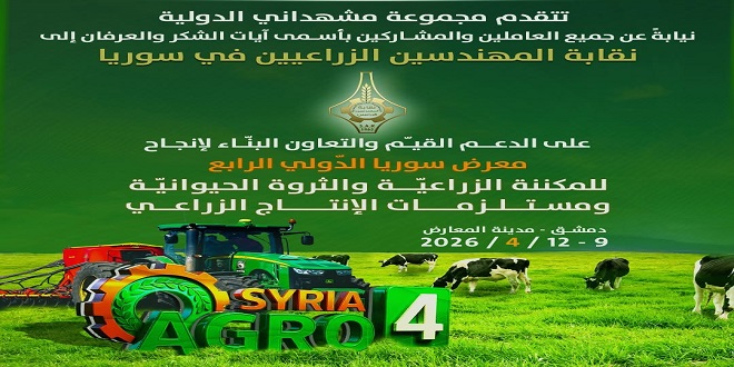 “نقابة المهندسين الزراعيين” الداعم الرئيسي لـ معرض سوريا الدولي الرابع للمكننة الزراعية والثروة الحيوانية ومستلزمات الإنتاج الزراعي “آغرو سيريا”، وذلك برعاية من وزارة الزراعة في الجمهورية العربية السورية، وبتنظيم مجموعة مشهداني الدولية، ينطلق معرض سوريا الدولي الرابع للمكننة الزراعية والثروة الحيوانية ومستلزمات الإنتاج الزراعي “آغرو سيريا”، وذلك على أرض مدينة المعارض بدمشق من تاريخ 9 وحتى 12 من الشهر الحالي.