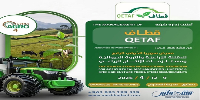 شركة “قطاف الزراعية” تشارك بمعرض سوريا الدولي الرابع للمكننة الزراعية والثروة الحيوانية ومستلزمات الإنتاج الزراعي “آغرو سيريا”