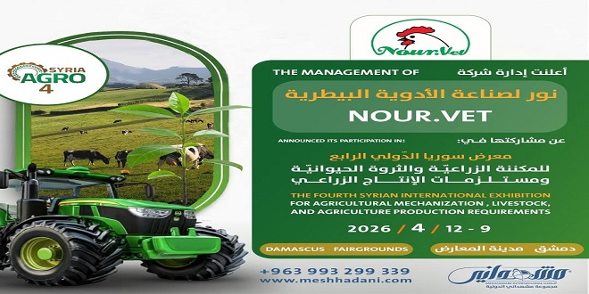 شركة “نور لصناعة الأدوية البيطرية” تشارك بمعرض سوريا الدولي الرابع للمكننة الزراعية والثروة الحيوانية ومستلزمات الإنتاج الزراعي “آغرو سيريا”
