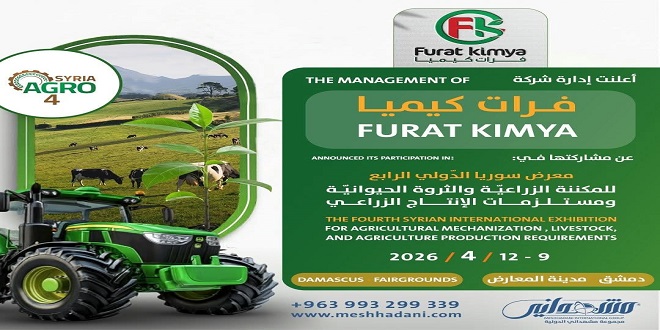 شركة “فرات كيميا” تشارك بمعرض سوريا الدولي الرابع للمكننة الزراعية والثروة الحيوانية ومستلزمات الإنتاج الزراعي “آغرو سيريا”