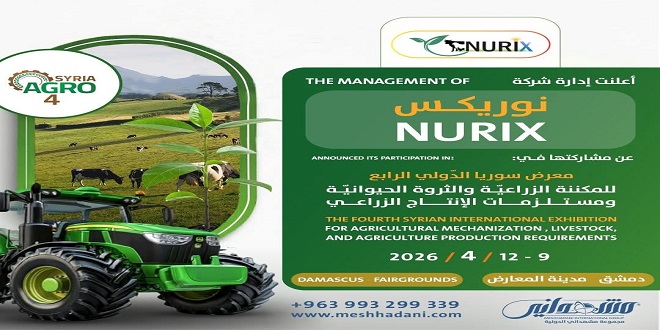أعلنت شركة “نوريكس“عن مشاركتها بمعرض سوريا الدولي الرابع للمكننة الزراعية والثروة الحيوانية ومستلزمات الإنتاج الزراعي “آغرو سيريا”، وذلك برعاية من وزارة الزراعة في الجمهورية العربية السورية، وبتنظيم مجموعة مشهداني الدولية، ينطلق معرض سوريا الدولي الرابع للمكننة الزراعية والثروة الحيوانية ومستلزمات الإنتاج الزراعي “آغرو سيريا”، وذلك على أرض مدينة المعارض بدمشق من تاريخ 9 وحتى 12 من الشهر الحالي.