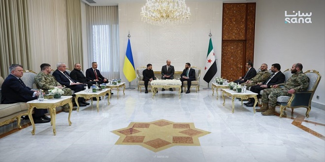 استقبل الرئيس أحمد الشرع في قصر الشعب بدمشق أمس الأحد، الرئيس الأوكراني “فولوديمير زيلينسكي”، بحضور وفد وزاري من البلدين، ومشاركة وزير الخارجية التركي “هاكان فيدان”، حيث جرى بحث سبل تعزيز العلاقات الثنائية والتعاون الاقتصادي.