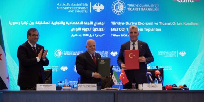 وقعت سوريا وتركيا،اليوم الثلاثاء، اتفاقية تعاون اقتصادي وتجاري، وذلك في ختام أعمال الاجتماع الأول للجنة الاقتصادية والتجارية المشتركة بين البلدين في مدينة إسطنبول.