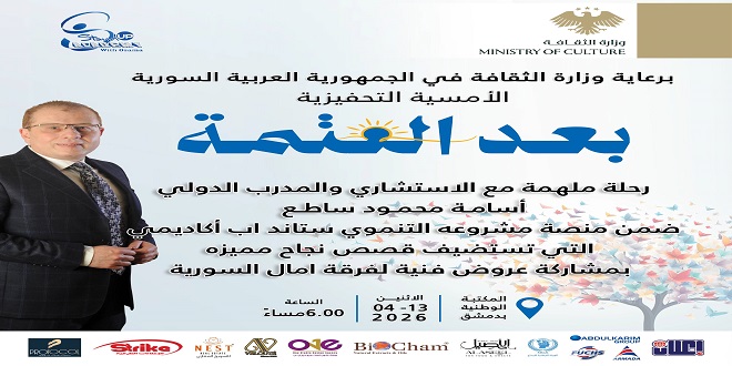 تواصل منصة مشروع “ستاند أب أكاديمي” التحفيزي التنموي الإبداعي، لمؤسسه المدرب الدولي “أسامة محمود ساطع”، نشاطاتها بانطلاق فعاليتها التاسعة في سوريا تحت عنوان ” بعد العتمة” ، وذلك على مسرح المكتبة الوطنية بدمشق، الساعة السادسة مساء يوم الاثنين 13 نيسان 2026.