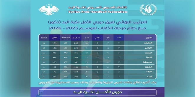 تصدر فريق الطليعة ترتيب الفرق في مرحلة الذهاب من دوري الأمل لكرة اليد، التي أقيمت في صالة أبو زيد الرياضية بحمص.